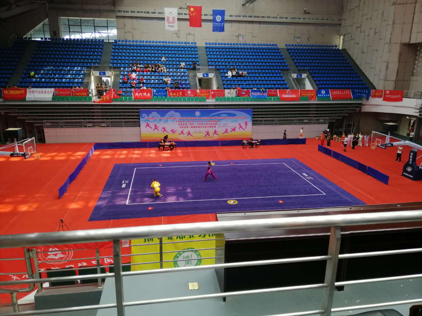6月25--29日在河南理工大学举行的河南省大学生第十五届武术锦标赛上我校武术队员在比赛中努力拼搏,不畏强手。